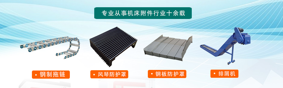 主要產(chǎn)品有:鋼板、不銹鋼板導軌防護罩、柔性風琴式導軌防護罩、不銹鋼片盔甲防護罩、伸縮式絲杠防護罩、油缸氣缸保護套、螺旋鋼帶保護套、卷簾伸縮防護罩、鋁型材防護簾、排屑機、機床工作燈、機床墊鐵、可調塑料冷卻管、金屬冷卻管、機床導軌刮屑板、T型撞塊槽板、塑料法蘭蓋、鋼管護帽等產(chǎn)品。